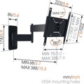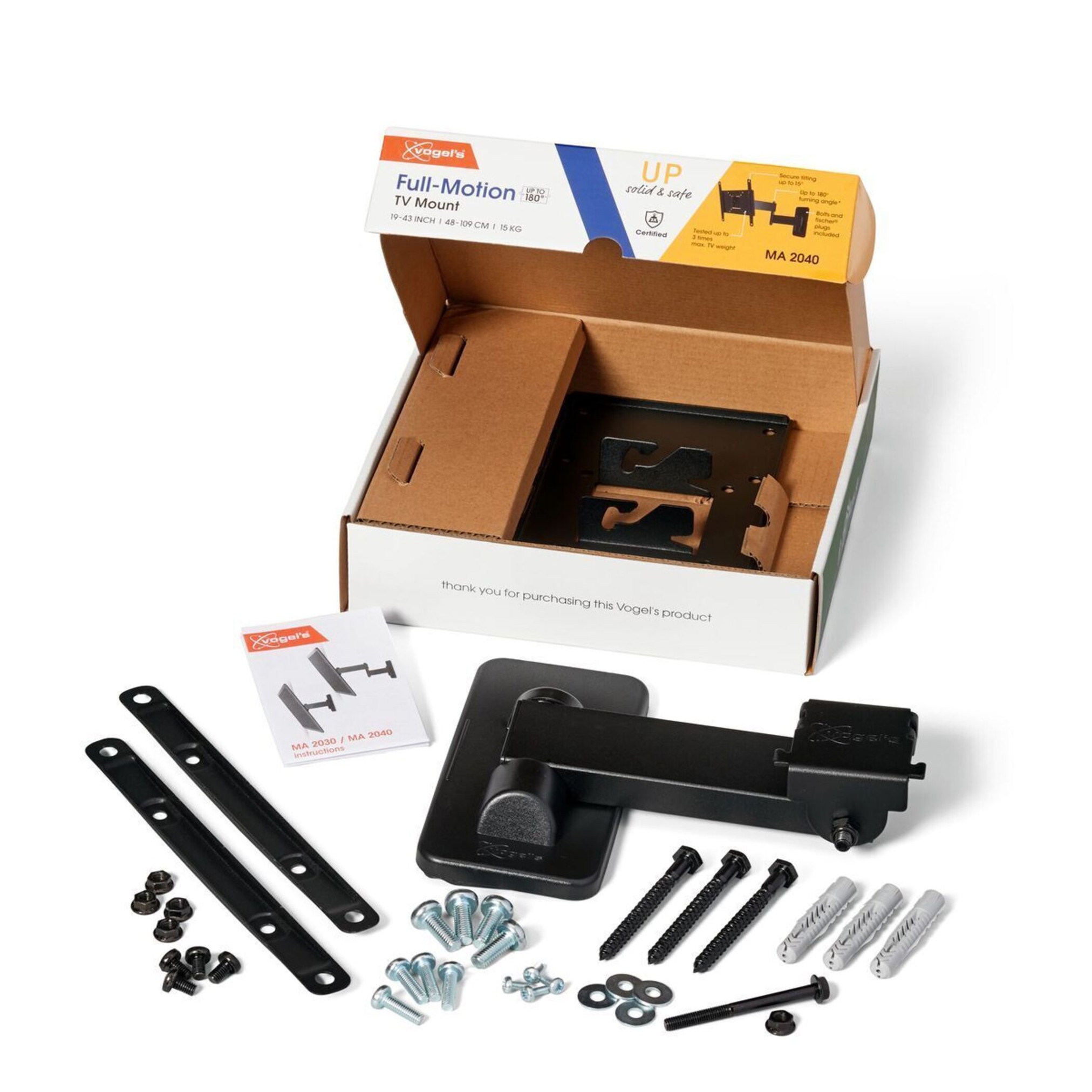 | Vogels MA 2040 Full-Motion nosač za TV Za televizore do 43 inča (102 cm) MA 2040 je prikladan TV nosač za srednje velike ekrane od 19 do 43 inča. Sigurno i jednostavno postavite televizore do 15 kg na zid. Savršen kut gledanja S MA 2040 možete rotirati televizor do 180°*. To znači da možete uživati u najboljoj slici bez obzira gdje sjedite u prostoriji. Je li vaš TV malo viši na zidu? Tada ga možete i naginjati prema naprijed do 15°. Dokazana kvaliteta TV nosači iz UP serije jači su nego što mislite. MA 2040 je prošao sve testove sigurnosti i izdržljivosti. Budite sigurni da je vaš televizor u dobrim rukama! *Najveći kut gledanja ovisi o veličini vašeg ekrana. Gledajte iz bilo kojeg dijela prostorije: okret do 180° Testirano do 3 puta maksimalna težina TV-a Vijci i Fischer® tiplovi uključeni Izbjegavajte odsjaje: nagib do 15° Pouzdana kvaliteta po pristupačnoj cijeni TÜV certificirano Ovaj proizvod je prošao opsežna testiranja kako bi se osigurala usklađenost s TÜV Nord standardom kvalitete. Vogelovi proizvodi testirani su da podnose barem 3 puta veću težinu od naznačene maksimalne. TÜV NORD je neovisno certifikacijsko tijelo i globalno prepoznato kao oznaka izvrsne kvalitete. Pojedinosti o proizvodu: EAN: 8712285331305 Boja: Crna Minimalna veličina ekrana (inch): 19 Maksimalna veličina ekrana (inch): 43 Maksimalna nosivost (kg): 15 Maksimalna rotacija: Puna rotacija (do 180°) Maksimalni nagib: Nagib do 15° VESA razmak rupa: 75 x 75 mm, 100 x 100 mm, 100 x 200 mm, 200 x 100 mm, 200 x 200 mm Minimalna udaljenost od zida (mm): 68 Maksimalna udaljenost od zida (mm): 388 Broj točaka zakretanja: 3 Namjena za vanjsku upotrebu: Ne Što se nalazi u paketu: Nosač za zid, komplet za montažu na zid s Fischer® Duo Power tiplovima, komplet za pričvršćivanje TV-a, Brzi vodič za instalaciju Kategorija proizvoda: TV nosač za punu rotaciju Serija proizvoda: UP | |