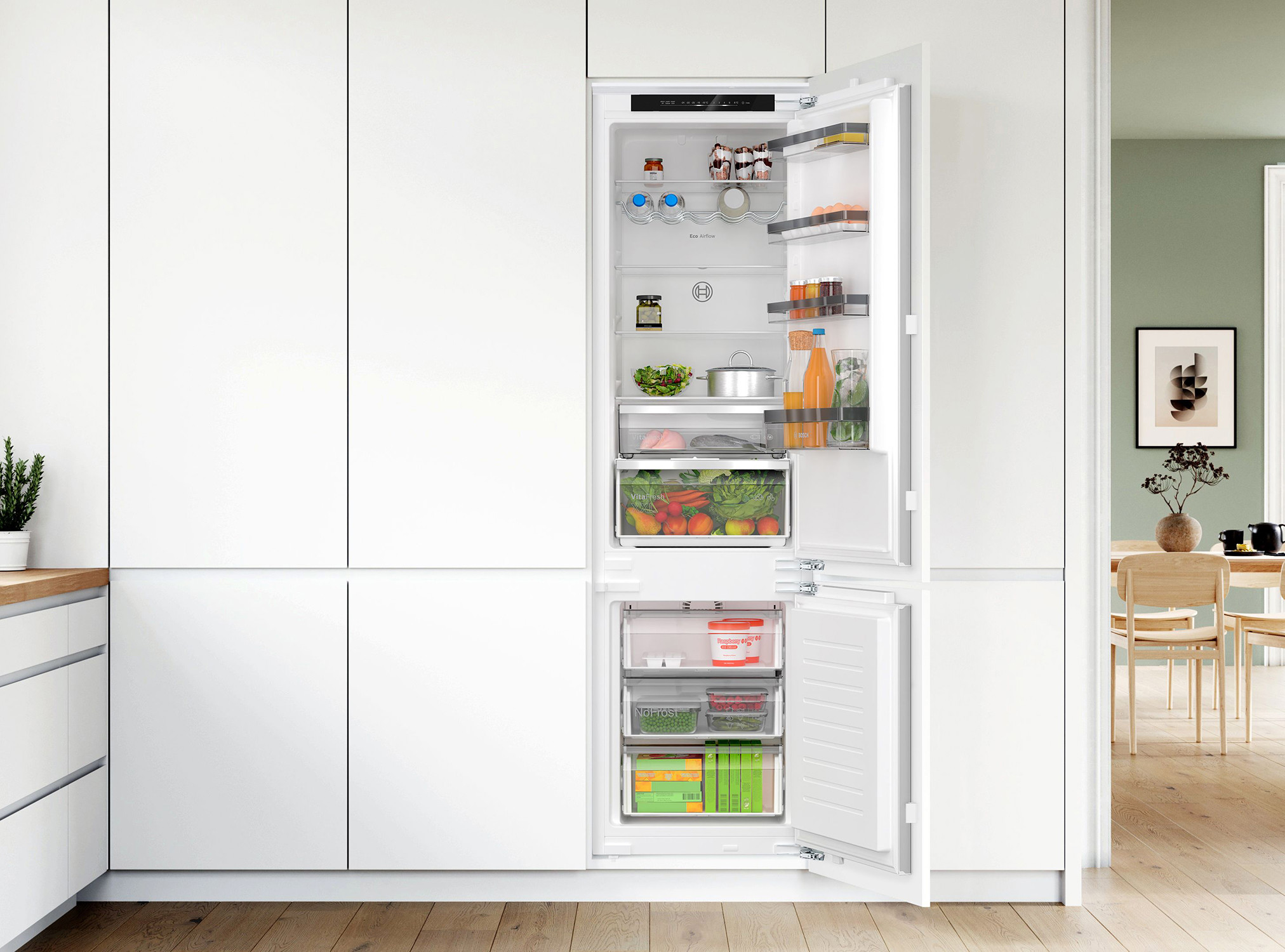 | //***Kupnjom uređaja u periodu od 1.10.2025 do 31.03.2026. godine, prijavite se u roku od 30 dana i registrirajte na Bosch portalu i ostvarite 100€ CASH BACK-a.**// KBN96VFE0 Serie 4, Ugradbeni hladnjak sa zamrzivačem na dnu, 193.5 x 70.8 cm, fiksna šarka Razred energetske učinkovitosti (EU19_EEK_D): E Ukupna neto zapremnina aparata (l): 383 l Prosječna godišnja potrošnja energije: 256 kWh/god Razina buke: 34 dB LED s Soft Start osvjetljenje hladnjaka NoFrost Home Connect Zasebna elektronička regulacija temperature s LED prikazom Odvojeno upravljanje temperature u rashladnom i zamrzivačkom dijelu Super hlađenje Akustički sistem upozoravanja kod otvorenih vrata, Optički i akustički sistem upozoravanja kod otvorenih vrata Automatsko odmrzavanje hladnjaka Neto kapacitet hladnjaka (l): 285 l Br. velikih površina za odlaganje na vratima: 1, broj malih površina za odlaganje: 3 Držač za boce Neto kapacitet zamrzivača (I): 98 l Kapacitet zamrzavanja (kg/24h) : 9.5 kg Vrijeme rasta temperature (h): 13 h Broj prozirnih pretinaca za zamrzavanje: 3 Dimenzije (V x Š x D): 194 x 71 x 55 cm Ugradbene dimenzije (V x Š x D): 194 x 71 x 56 cm Desno otvaranje vrata, podesivo Sprijeda noge podesive po visini, straga kotačići Klimatski razred: SN-ST Napon: 220 - 240 V V 1 x Posuda za ledene kocke 2 god. tvorničkog jamstva XXL kapacitet: mala razlika u širini ali ogromna u litraži, Bosch XXL hladnjaci pružaju puno više prostora za vašu hranu. Kad trebate prostran hladnjak koji ne zauzima previše prostora u vašoj kuhinji, naši hladnjaci s kapacitetom XXL odgovorit će na vaše zahtjeve. Oni su tek malo širi od standardnih modela, ali u njih možete staviti limove za pečenje, velike lubenice i druge glomazne stvari. Prostranija unutrašnjost hladnjaka preglednija je i prilagođava se vašim potrebama jer vi možete posložiti staklene police kako vama odogovara Primjerice u zamrzivaču možete ukloniti sve police iz odjeljka i tako stvoriti više mjesta. VitaFresh ladica iz Boscha: Živjeti zdravo nikada nije bilo jednostavnije. U Bosch hladnjacima vaše voće i povrće dulje zadržava vitamine i ostaje svježe. Vitamini u voću i povrću ostaju svježi dulje nego kada ih čuvamo u klasičnim ladicama zahvaljujući klimatski kontroliranom prostoru. VitaFresh XXL sustav putem kontrole temperature kreira idealni prostor za očuvanje namirnica dulje svježima. Uvjeti u VitaFresh ladici se mogu prilagoditi, ovisno o vrstama voća i povrća koje se nalazi u hladnjaku. Zadržite kvalitetu vaših namirnica. Uz Bosch hladnjake dobivate više hrane za uživanje, manje hrane za bacanje! No Frost: Pozdravite se s odmrzavanjem hladnjaka. Ručno odmrzavanje hladnjaka može biti iznimno neugodan i dugotrajan postupak. Zahvaljujući našim novim hladnjacima s funkcijom NoFrost taj zadatak s lakoćom možete zauvijek prekrižiti na popisu svojih zadataka. Za razliku od klasičnih hladnjaka vlažnost zraka u hladnjaku NoFrost trajno se sakuplja u središnjoj jedinici za hlađenje koja se redovno automatski odmrzava. Kondenzacija koja pritom nastaje jednostavno se odvodi iz hladnjaka i tamo ishlapljuje. Tako sustav NoFrost trajno oslobađa vaš hladnjak od leda, ali i potrebe ručnog odmrzavanja. | |