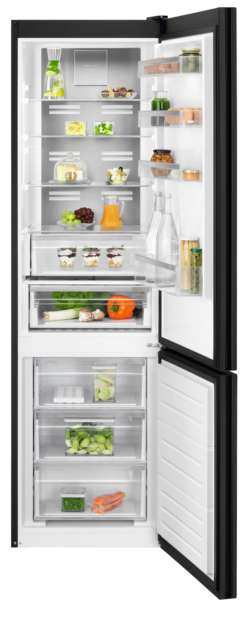 | Kombinirani hladnjak 800 Cooling 360° sa ledenicom dolje hladnjak 266 L (244 + 22 Fresh Zona), ledenica 101 L Energetska klasa A++ E(20) E, Buka 38 dB E(20) C Elektronski LED termometar i 2 termostata u unutrašnjosti, , TwinTech® - FrostFree - odvojeno hlađenje hladnjaka (klasično hlađenje) i ledenice NO FROST (hlađenje zrakom) Inverter Kompresor Održavanje u slučaju nestanka struje: Zamrzivač 18h / Hladnjak E(20) 10h MultiFlow 360 Metal Cooling - distribucija zraka po policama sa kontrolom vlage Crno STAKLO vrata sa premazom protiv otisaka prstiju - desna ili lijeva Elektronske kontrole na dodir s LCD pokazivačem u hladnjaku; Svijetlo: LED Sa strane FUNKCIJE ELEKTRONIKE: Brzo zamrzavanje sa Auto Return Intenzivno hlađenje novih namirnica Audio Indikator otvorenih vrata (samo hladnjak) Vrata: 3x velike, 2x 8 jaja, 1x velika za boce, , Hladnjak; Police: 3 velike; Ladice: 1 za voće i povrče sa kontrolom vlage + 1 ExtraChill FLEKSIBILNA ledenica sa 3 velike ladice / 2 police; Zamrzavanje 8,0Kg/24h Dimenzije u cm: 201 V x 59.5 Š x 65 D 5 (2+3) godina jamstva Electrolux promocija 5 (2+3) godina jamstva na određene aparate bijele tehnike u razdoblju 01.01. - 31.12.2026. uz online registraciju, više detalja na: www.electrolux.hr link za prijavu: https://bit.ly/3YiQPhL | |