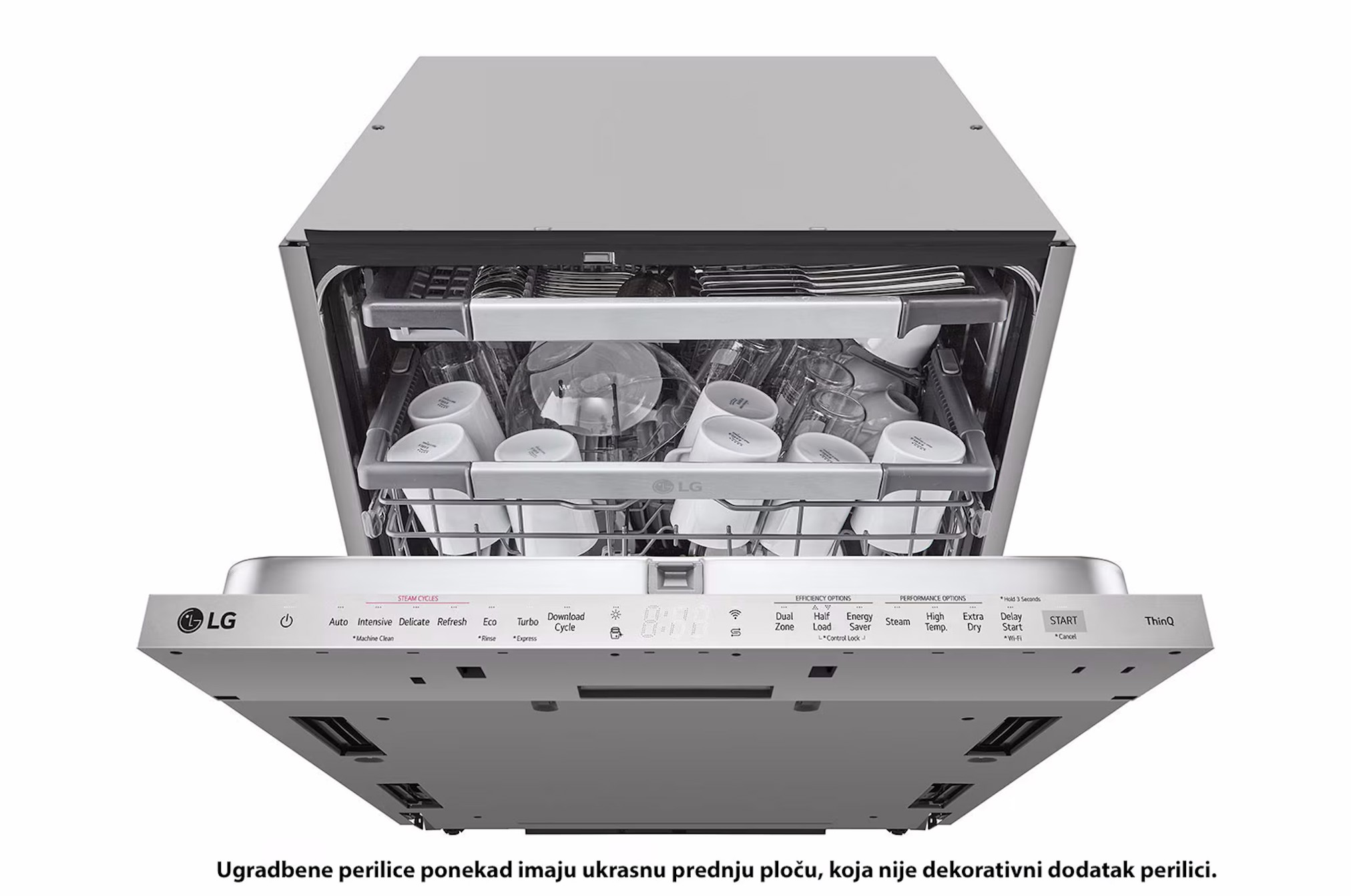 | QuadWash™ ugradbena perilica posuđa s TrueSteam™ tehnologijom pranja vodenom parom, vrata s automatskim otvaranjem, 14 kompleta posuđa, ThinQ™ WiFi funkcija Uz pomoć vodene pare, tehnologija TrueSteam™ uklanja prljavštinu sa pribora za jelo i posuđa, ostavljajući vaše posuđe blistavo čistim LG inverterski Direct Drive motor s izravnim pogonom osmišljen je s posebnim fokusom na tihi rad. Uz mali broj pokretnih dijelova, osiguran vam je pouzdan rad i učinkovitost jedne od najtiših perilica posuđa u svojoj klasi. Vrsta instalacije: Ugradbena Vrsta ploče: Gornje upravljanje Vrsta zaslona: LED TrueSteam™ QuadWash™ Sustav pranja SenseClean Sustav pranja Vario Broj krakova za prskanje: 4 Omekšivač vode Aqua-Stop Dozator deterdženta i sredstva za ispiranje Vrata na automatsko otvaranje Senzor nečistoće (zamućenosti) Inverter Direct Drive Motor Smart Rack+™ Indikatori statusa Treća polica podesive visine (podesiva) Broj ciklusa pranja (program): 10 Auto, Intenzivno, Osjetljivo, Osvježenje, Eco, Turbo, Preuzimanje programa pranja, Ispiranje, Ekspresno Broj opcija: 8 Dvostruka zona Pola punjenja Ušteda energije Para Visoka temp. Dodatno suho Odgoda početka Zaključavanje kontrola Poništi Čišćenje perilice: Strojno čišćenje (para) ThinQ(Wi-Fi) Smart Diagnosis Upravljanje na daljinu Potrošnja vode (L): 9,5 Razina buke (dBA): 43 Razred emisije buke: B (A - D skala) Promocija 5 godina sigurnosti (2 godine redovnog jamstva + 3 godine osiguranja) u periodu od 01.04.2026. do 30.06.2026. Za više informacija posjetite https://www.lg.com/hr/kucanski-aparati | |