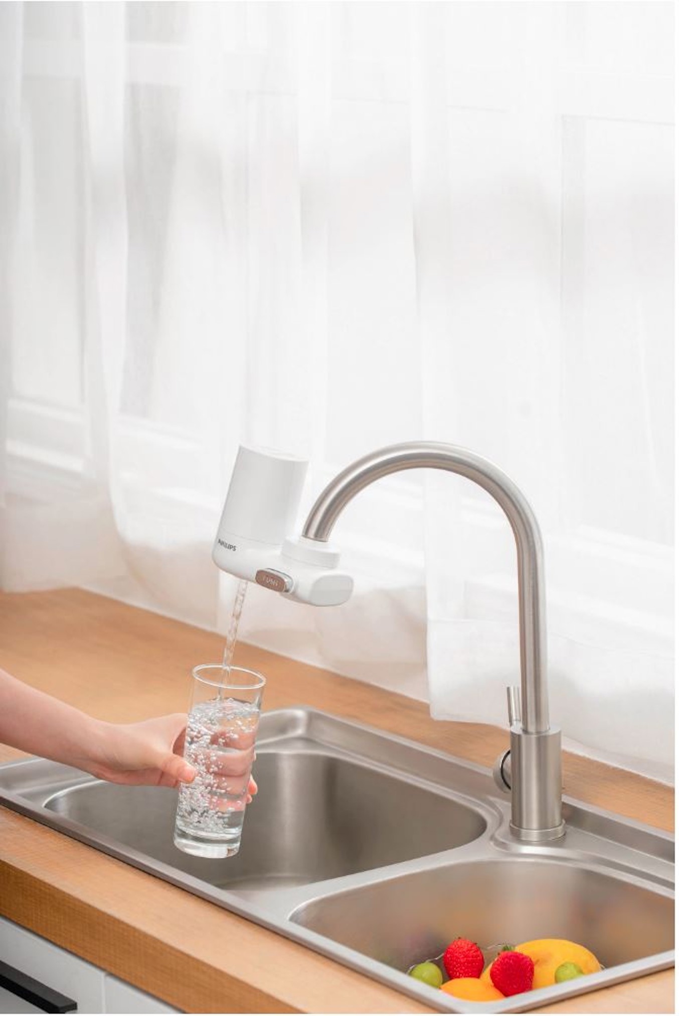 | Uživajte u bistroj vodi čistog okusa kad god otvorite slavinu, uz Philips X-Guard mikrofiltracijski sustav koji smanjuje do 99% klora i tvari koje kvare okus. Jednostavna instalacija jednim klikom omogućuje postavljanje na slavinu u nekoliko sekundi. Jednostavno mijenjajte svježe filtriranu i nefiltriranu vodu.Filtrirana voda u mlazu prilagođena je za piće i kuhanje, dok je nefiltrirani način raspršivanja (tuš) prikladan za pranje posuđa, voća, povrća i u druge svrhe. Jednostavna zamjena filtera- filter kojem je istekao rok trajanja bez napora zamijenite novim jednostavnim okretanjem (twist). Instalacija Philips On-tap za filtriranje vode na slavini jednim klikom - nema potrebe za vodoinstalaterom. Nakon što je adapter ispravno instaliran, jednostavno pričvrstite filter na slavinu i uređaj je spreman za rad! Indikator vas podsjeća kada trebate zamijeniti filtar za najbolji rezultat. Učinkovito smanjuje klor i tvari koje kvare okus vode. Sa svojim visokokvalitetnim prirodnim aktivnim ugljenom, ovaj X-Guard filter smanjuje do 99% klora i tvari koje stvaraju neugodan okus. Za vodu čistog okusa. Voda izvrsnog okusa uz koju štedite i smanjujete onečišćenje plastikom. Kapacitet filtera odgovara količini od 2000 plastičnih bočica 0.5L Specifikacije: Trajanje filtera: do 6 mjeseci (ovisno o kvaliteti vode) Kapacitet filtera:do 1000 L Kompatibilni filteri:AWP305,AWP305P2,AWP315 Protok vode: 2 L/min Pritisak vode (input): 0.15 - 0.35 MPa bar Sadržaj pakiranja:on tap uređaj, filter, 5 adaptera, mini ključ za instaliranje Philips Water Solutions nudi rješenja za filtraciju vode u kućanstvima i poslovnim prostorima. Uređaji za filtriranje vode na održiviji način rješavaju probleme s vodom, pružajući zdravu i ukusnu vodu. | |