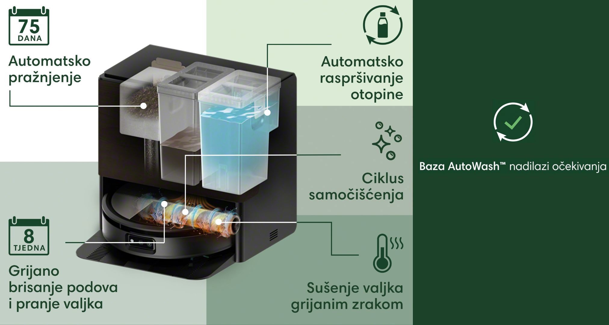 | Robotski usisavač Roomba® Max 705 Combo Robot + Baza AutoWash™ naš je najbolji 2-u-1 robotski usisavač i perač podova za užurbane domove s djecom i krznenim kućnim ljubimcima. Pruža kontinuirano čišćenje s krpom za brisanje s rotirajućim čišćenjem i grijanim brisanjem za rješavanje zaglavljenih nereda. Vrhunsko usisavanje s najvišom razinom usisavanja iRobota i PowerSpin™ valjkom za brisanje s PerfectEdgeom® tehnologijom. Dizajniran za beskompromisno čišćenje, Roomba® Max 705 Combo Robot + Baza AutoWash™ uklanja ostatke u prometnim domovima koji vole djecu i kućne ljubimce. Opremljen krpom za brisanje s rotirajućim čišćenjem, detaljnim čišćenjem rubova, dvostrukim gumenim četkama protiv zapetljavanja i snažnom bazom za potpuno čišćenje bez ruku, dan za danom. Sadržaj paketa: 1x Roomba® Max 705 Combo 1x Baza AutoWash™ 1x kabel za napajanje 1x dodatna vrećica za smeće 1 x dodatni filter 2 x dodatne četke za brisanje rubova 1 x bočica s uzorkom koncentrata za čišćenje (30 ml)ClearView™ Pro LiDAR s PrecisionVision™ AI tehnologijom brzo mapira i imenuje cijeli vaš dom uz izradu 3D karte, inteligentno navigira i planira optimalnu rutu čišćenja kako bi očistio svaku sobu bez propuštanja mjesta. S naprednim prepoznavanjem objekata, točno zna što je ispred i zna što treba učiniti - izbjegava predmete svih veličina (uključujući kablove, čarape, igračke i izmet kućnih ljubimaca) ili dublje čisti prljavija područja. Višenamjenska priključna stanica pruža kontinuiranu praktičnost bez ruku - automatski prazni spremnik robota, dopunjuje tekućinu za brisanje uz dodavanje upravo prave količine otopine za čišćenje te pere i suši krpu za brisanje toplinom. Od brenda kojem vjerujete: Potkrijepljeno s više od 30 godina stručnosti u robotici, inovacijama i odgovornom, nagrađivanom korisničkom službom. Tehnička specifikacija: Dimenzije robota (cm) D x Š x V: 37,2 × 36,6 × 10,5 Težina robota (kg): 5.72 Vrsta baterije: 6000 mAh litij željezo fosfatna (LFP) baterija Tipke na upravljačkoj ploči robota: HOME I POWER PrecisionVision™ AI + ClearView™ Pro LiDAR tehnologija za brzo mapiranje i temeljito čišćenje Valjak za brisanje poda PowerSpin™ s tehnologijom PerfectEdge® Iznimna usisna snaga (13 000 Pa) | |