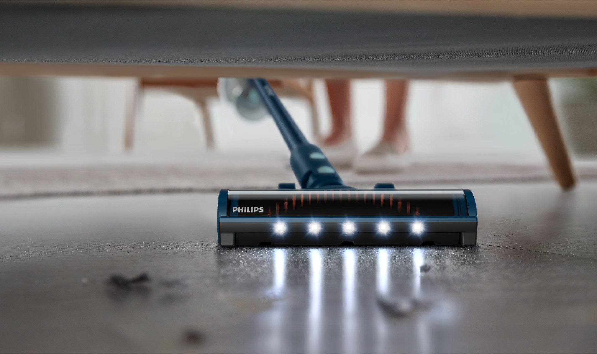 Philips bežicni štapni usisavac otkriva skrivenu prašinu zahvaljujuci usisnom nastavku s LED svjetlom i uklanja jeu zahvaljujuci tehnologiji PowerCyclone 10.